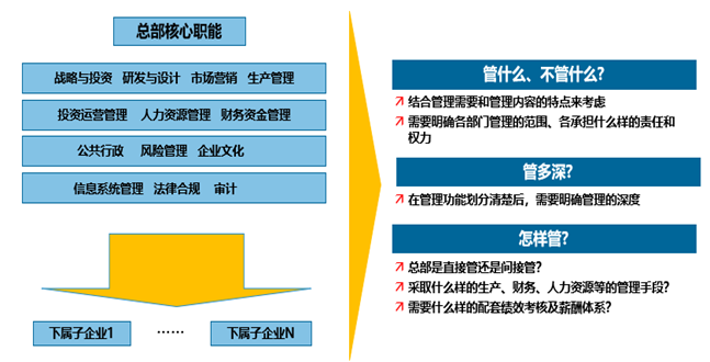 一是構(gòu)建“小總部、大集團(tuán)”的職能體系。集團(tuán)對于子企業(yè)的董事會應(yīng)充分授權(quán)放權(quán),做強(qiáng)子企業(yè)董事會自主經(jīng)營決策的功能。依據(jù)“小總部、大集團(tuán)”的基本原則,對集團(tuán)組織職能體系進(jìn)行大幅精簡,建立精干、規(guī)范、高效的組織機(jī)構(gòu)和決策體系。通過下放職能、整合交叉職能、加強(qiáng)核心職能,明確“管什么、不管什么,管多深,怎樣管”,完成集團(tuán)總部職能的重塑優(yōu)化。