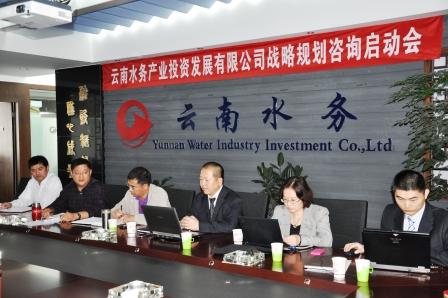2011年10月13日,云南水務(wù)產(chǎn)業(yè)投資有限公司戰(zhàn)略規(guī)劃暨整體發(fā)展戰(zhàn)略與業(yè)務(wù)規(guī)劃項目在昆明啟動。我公司總經(jīng)理陳慶博士(右二)及求是項目組成員出席啟動會。
