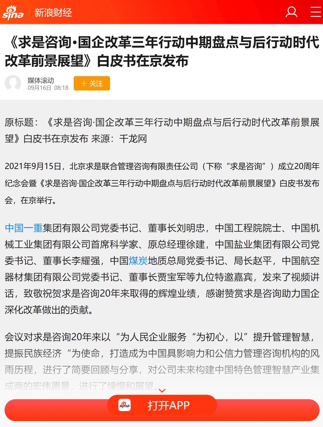 《新浪財(cái)經(jīng)》:《求是咨詢·國企改革三年行動中期盤點(diǎn)與后行動時(shí)代改革前景展望》白皮書在京發(fā)布