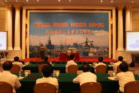 為解放思想,應(yīng)對危機(jī),深化改革,提升管理,武鋼集團(tuán)在湖北咸寧碧桂園鳳凰溫泉酒店,隆重開辦了為期三天的武鋼領(lǐng)導(dǎo)人員學(xué)習(xí)研討班。學(xué)習(xí)班還邀請了軍事經(jīng)濟(jì)學(xué)院院長周來信少將、神化集團(tuán)董事長張喜武、亞琛工業(yè)大學(xué)冶金系主任Bleck教授、中國鋼鐵協(xié)會名譽(yù)會長吳溪淳、GE公司中國區(qū)總裁Mark、海爾集團(tuán)董事會主席張瑞敏作精彩的專題講座。
