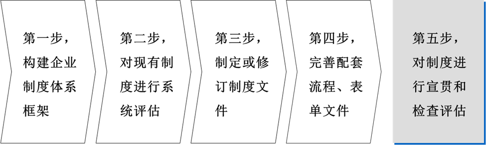 企業(yè)制度體系,是員工在企業(yè)日常生產(chǎn)經(jīng)營過程中共同遵守的規(guī)定和準(zhǔn)則,是企業(yè)賴以生存和發(fā)展的基礎(chǔ),是企業(yè)正常運營的保障機制。一家小公司,在制度不健全的情況下,依靠管理者的經(jīng)驗和能力或許可以維持公司正常運營,當(dāng)企業(yè)發(fā)展到一定規(guī)模,再單純依靠“人治”顯然是不夠的;大公司擁有較為復(fù)雜的組織架構(gòu)和更多的員工,更需要依靠“法治”即規(guī)范的制度體系來保障公司的良好運營。成功的企業(yè)離不開健全的制度體系以及制度的有效執(zhí)行。建立健全企業(yè)制度體系,可以采取以下五個步驟有序推進。