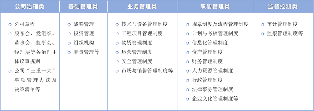 除以上類別制度,國有企業(yè)還需要重點從兩個方面強化制度體系建設(shè):一方面,需要依據(jù)財政部等五部委聯(lián)合發(fā)布的《企業(yè)內(nèi)部控制配套指引》等內(nèi)控政策,滿足國企制度體系建設(shè)合規(guī)性方面的要求;另一方面,需要強化黨建管理類制度體系建設(shè),具體包括黨組織管理、紀(jì)檢管理、工會管理、團委管理等子類別制度。