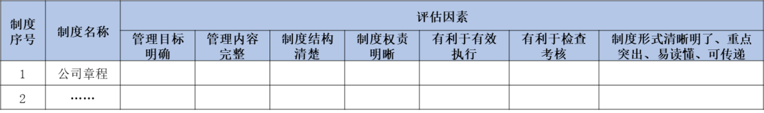 現(xiàn)有制度可以從以下幾個維度著手進行系統(tǒng)評估:管理目標(biāo)是否明確?管理內(nèi)容是否完整?制度結(jié)構(gòu)是否清楚?制度權(quán)責(zé)是否明晰?是否有利于有效執(zhí)行?是否有利于檢查考核?制度形式是否清晰明了、重點突出、易讀懂、可傳遞?