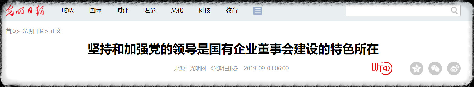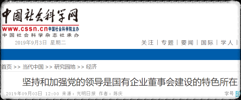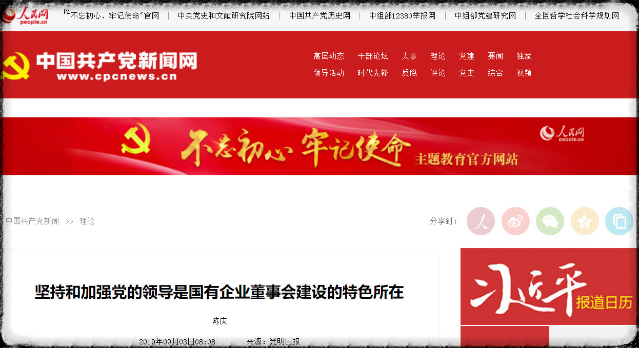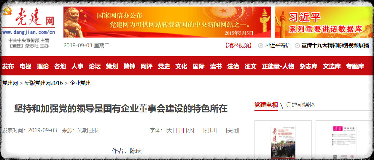 2019年9月3日,《光明日?qǐng)?bào)》經(jīng)濟(jì)學(xué)理論版刊發(fā)了求是咨詢總經(jīng)理、首都經(jīng)濟(jì)貿(mào)易大學(xué)工商管理學(xué)院副教授陳慶博士《堅(jiān)持和加強(qiáng)黨的領(lǐng)導(dǎo)是國(guó)有企業(yè)董事會(huì)建設(shè)的特色所在》的署名文章。陳慶博士結(jié)合求是咨詢多年黨建咨詢經(jīng)驗(yàn)和研究成果,清晰梳理了國(guó)有企業(yè)董事會(huì)建設(shè)在試點(diǎn)、規(guī)范和完善等不同階段黨組織地位變化的發(fā)展邏輯,創(chuàng)造性地提出:黨組織在公司法人治理中法定地位的確立,實(shí)現(xiàn)了中國(guó)特色國(guó)有企業(yè)董事會(huì)建設(shè)的理論創(chuàng)新。文章被光明網(wǎng)、人民網(wǎng)、國(guó)務(wù)院國(guó)有資產(chǎn)管理委員會(huì)、黨建網(wǎng)等多家官媒、網(wǎng)站轉(zhuǎn)載。