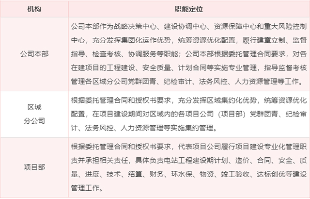 項(xiàng)目公司設(shè)“四會(huì)一層”,通過股東會(huì)、黨組織會(huì)、董事會(huì)、監(jiān)事會(huì)、總經(jīng)理辦公會(huì)進(jìn)行決策,項(xiàng)目建設(shè)期間項(xiàng)目公司不設(shè)管理部門,到一定階段設(shè)生產(chǎn)準(zhǔn)備部門,到項(xiàng)目竣工投產(chǎn)時(shí)再配相關(guān)部門;區(qū)域分公司設(shè)“一會(huì)一層”,通過黨委會(huì)、總經(jīng)理辦公會(huì)進(jìn)行決策,設(shè)若干職能部門和業(yè)務(wù)部門進(jìn)行日常管理;項(xiàng)目部設(shè)“一會(huì)一層”,通過黨支部會(huì)、總經(jīng)理辦公會(huì)進(jìn)行決策,設(shè)若干業(yè)務(wù)部門和職能部門進(jìn)行日常管理。