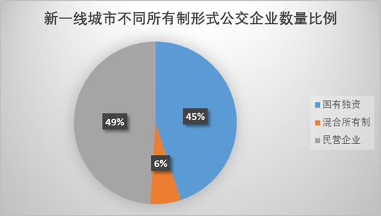 新一線城市選取了成都市、重慶市、杭州市、天津市、鄭州市等5個城市。調(diào)研數(shù)據(jù)顯示:國有獨資公交企業(yè)22家,占比45%,民營公交企業(yè)24家,占比49.0%,混合所有制公交企業(yè)3家,占比6%。新一線城市都有一個大型的國有獨資公交企業(yè),公交資源大部分是國家所有,僅成都市和鄭州市民營企業(yè)相對數(shù)量較多,主要負(fù)責(zé)部分縣區(qū)的公交線路運營。