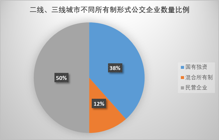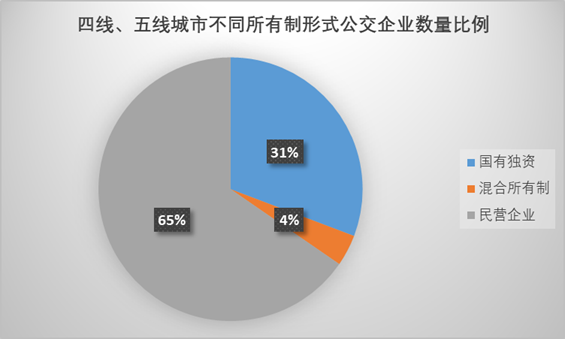 四線城市選取了湘潭市、桂林市、商丘市等3個城市,五線城市選取了伊犁哈薩克自治州、銅陵市、涼山彝族自治州、衡水市四個城市。調(diào)研數(shù)據(jù)顯示:國有獨資公交企業(yè)16家,占比31%,民營公交企業(yè)34家,占比65%,混合所有制公交企業(yè)2家,占比4%。隨著城市經(jīng)濟(jì)發(fā)展水平的降低,民營公交企業(yè)的數(shù)量總體有一定程度的上升,但是公交企業(yè)的所有制形式與地區(qū)的管理方式有較密切的關(guān)系,例如桂林市、商丘市、衡水市除城區(qū)由國有企業(yè)提供公交運營,縣區(qū)公交基本由民營企業(yè)根據(jù)區(qū)域劃分進(jìn)行運營。