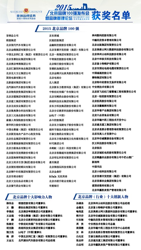 北京求是聯(lián)合管理咨詢有限責(zé)任公司、首鋼總公司、聯(lián)想集團(tuán)、北京現(xiàn)代汽車有限公司、北京金隅集團(tuán)有限責(zé)任公司、中國(guó)北京同仁堂(集團(tuán))有限責(zé)任公司、北京全聚德(集團(tuán))有限責(zé)任公司、清華同方股份有限公司、北京北大方正集團(tuán)公司、北京首都創(chuàng)業(yè)集團(tuán)有限公司、北京燕京啤酒集團(tuán)公司、北京匯源飲料食品集團(tuán)有限公司、北京古船食品有限公司、北京大寶化妝品有限公司、北京物美投資集團(tuán)有限公司、國(guó)美電器有限公司、北京金融街控股股份有限公司、京東商城、北京王府井百貨(集團(tuán))股份有限公司、北京新東方教育科技(集團(tuán))有限公司、首都機(jī)場(chǎng)集團(tuán)公司、北京電視臺(tái)、北京銀行股份有限公司、新浪網(wǎng)、華夏銀行、中青旅控股股份有限公司、神州數(shù)碼控股有限公司、北京金鼎軒酒樓有限責(zé)任公司、北京銅牛針織集團(tuán)公司等榮獲“2015北京品牌100強(qiáng)"。