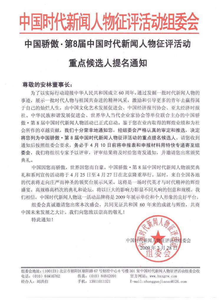 我司總裁安林博士憑借其和北京求是聯(lián)合管理咨詢公司在業(yè)界所取得的輝煌成績和為社會所作的貢獻(xiàn),榮獲“中國驕傲-第8屆中國時代新聞人物重點候選人提名”。
