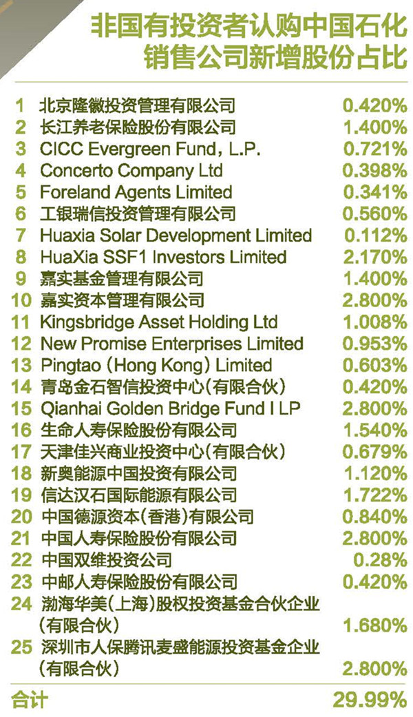 9月14日,中國(guó)石化發(fā)布公告稱,其全資子公司中國(guó)石化銷售有限公司已與25家境內(nèi)外投資者簽署增資協(xié)議。25家投資者以現(xiàn)金1070.94億元認(rèn)購(gòu)增資后銷售公司29.99%的股權(quán)。其中,占股最大的四家分別為中國(guó)人壽、深圳人保騰訊麥?zhǔn)⒛茉赐顿Y基金(有限合伙)、QianhaiGoldenBridgeFundILP、嘉實(shí)資本,各占2.8%的股權(quán)。