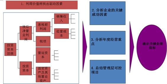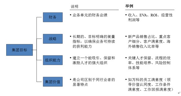 績效考核指標(biāo)體系要建立在集團(tuán)戰(zhàn)略目標(biāo)要求的基礎(chǔ)之上。借助價(jià)值樹,找出驅(qū)動集團(tuán)整體經(jīng)營良性發(fā)展的因素,并通過分析集團(tuán)關(guān)鍵成功因素,總結(jié)年度經(jīng)營重點(diǎn),列出管理層可控項(xiàng)目,最終確定出集團(tuán)組織績效的關(guān)鍵業(yè)績指標(biāo)。如圖所示: