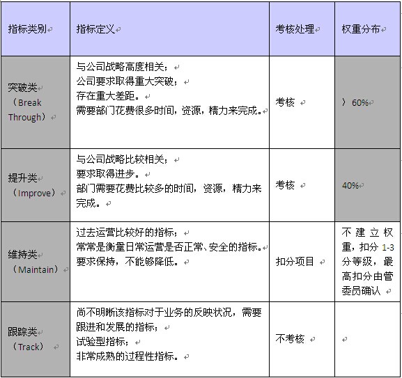 指標(biāo)權(quán)重的確定要根據(jù)該指標(biāo)與集團(tuán)戰(zhàn)略的相關(guān)度不同有所區(qū)別,相關(guān)度強(qiáng)的指標(biāo)為突破類指標(biāo),該指標(biāo)的權(quán)重相應(yīng)要高一些;比較相關(guān)的為提升類指標(biāo),這類指標(biāo)的權(quán)重相對突破類指標(biāo)要低一些;對于各級組織過去運(yùn)營比較好的指標(biāo),要維持,可不設(shè)權(quán)重,但不完成的情況下應(yīng)相應(yīng)扣分;還有一種跟蹤類指標(biāo),這類指標(biāo)是指尚不確定其對集團(tuán)公司業(yè)務(wù)的反應(yīng)狀況,需要跟進(jìn)和發(fā)展的,或是非常成熟的過程性指標(biāo),建議不考核。