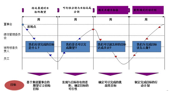 目標(biāo)制定程序如果流于形式,溝通機(jī)制不健全,不能保障相關(guān)人員的充分參與,就容易造成績效管理就是考核的錯誤理念。下圖是完整的目標(biāo)制定流程示意圖。