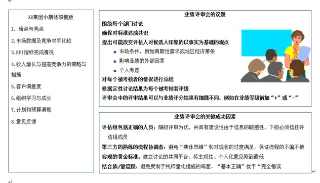 組織績效管理過程中,集團(tuán)公司要建立業(yè)績述職機(jī)制,定期進(jìn)行業(yè)績評審會。評審會要有明確的議題,包括與各組織就指標(biāo)標(biāo)準(zhǔn)達(dá)成共識,對被考核者的情況進(jìn)行總結(jié),為各組織進(jìn)行評級等內(nèi)容。具體如下圖所示。