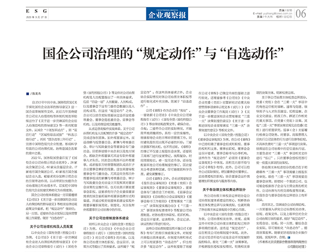 2023年3月27日,求是咨詢副總經(jīng)理陳高杰撰文《國企公司治理的“規(guī)定動作”與“自選動作”》刊發(fā)于《企業(yè)觀察報》。