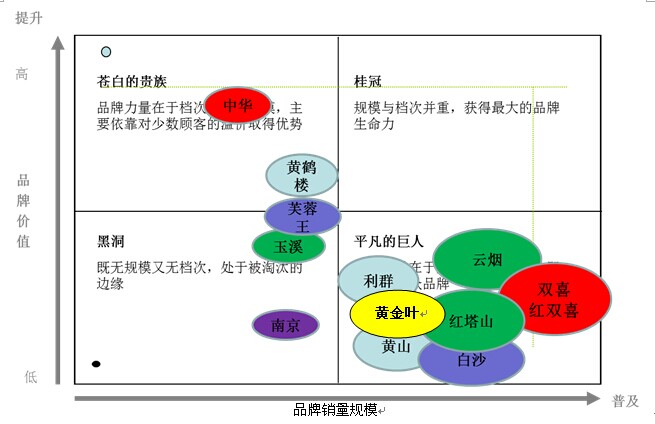 云煙、紅塔山、雙喜、白沙、黃山、利群、黃金葉等品牌銷量大品牌價(jià)值相對(duì)不高屬于平凡的巨人,利群、黃金葉和黃山的重點(diǎn)是提高銷量,培育品牌,提高品牌價(jià)值。云煙、紅塔山、白沙、雙喜重點(diǎn)是提高品牌價(jià)值,提高銷量空間比較小。